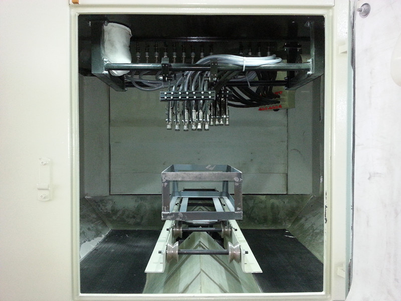 該機(jī)工作方式:將工件套裝在夾具(夾具客戶自制且安放于噴砂機(jī)主機(jī)艙內(nèi)轉(zhuǎn)動(dòng)導(dǎo)軌上)上,推動(dòng)夾具到指定位置,關(guān)閉所有艙門(mén),啟動(dòng)風(fēng)機(jī)后即可開(kāi)始對(duì)工件進(jìn)行噴砂,噴砂時(shí)間結(jié)束(即當(dāng)前工件已加工好),打開(kāi)艙門(mén),卸出工件;如此循環(huán)。